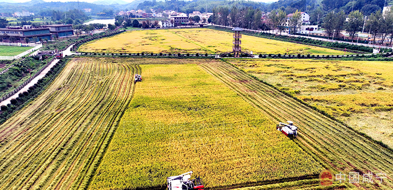 Recently, the mid-season rice harvest season has arrived in Dayankou, Gaoqiao Town, Xian'an District. Agricultural machinery operators are busy harvesting rice across the fields, creating a bustling scene.